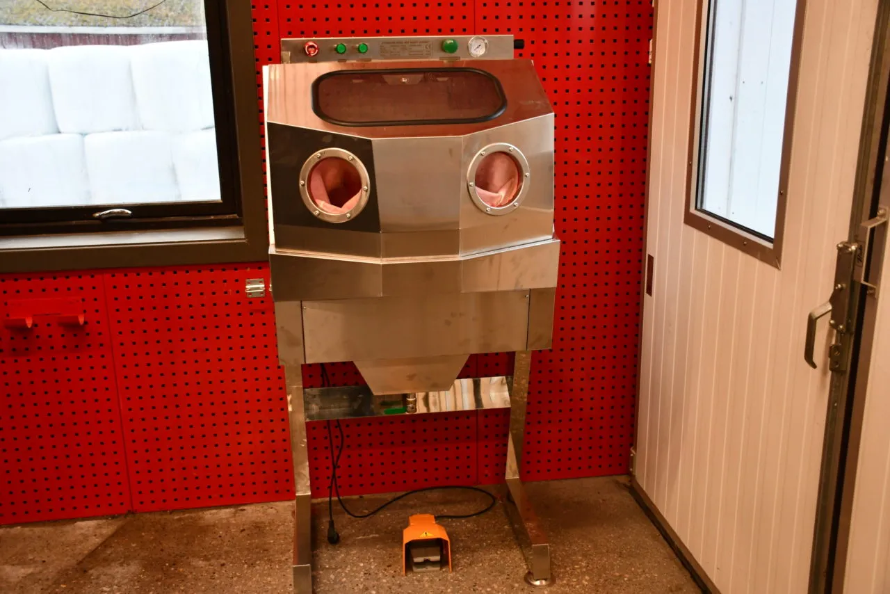 Vannpoleringskabinett på ca 185 liter i rustfritt stål til blåsing av aluminiumsdeler og deler der en polert å glatt overflate ønskes. Vann og glass blandes og pumpes opp til dysen. der trykkluft tilføres for å skape effektiv blåsing . Blandingen resirkuleres i systemet. Det er veldig viktig at det som skal blåses er helt rent for at resultatet skal blir bra.